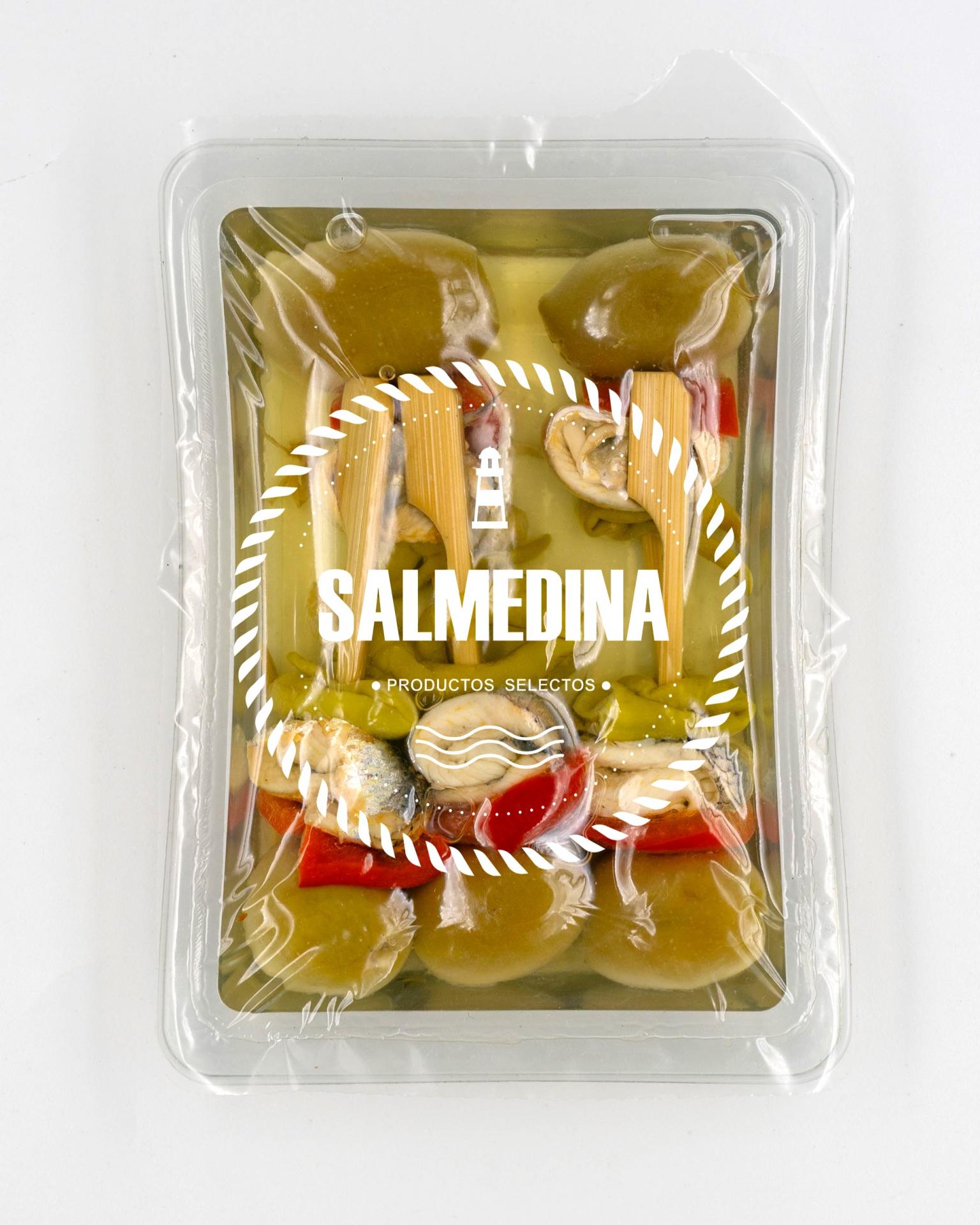 Tarrina de Gildas termosellada, compuesta de aceituna gordal, boquerón en vinagre pimiento rojo y piparra. 5 Unidades