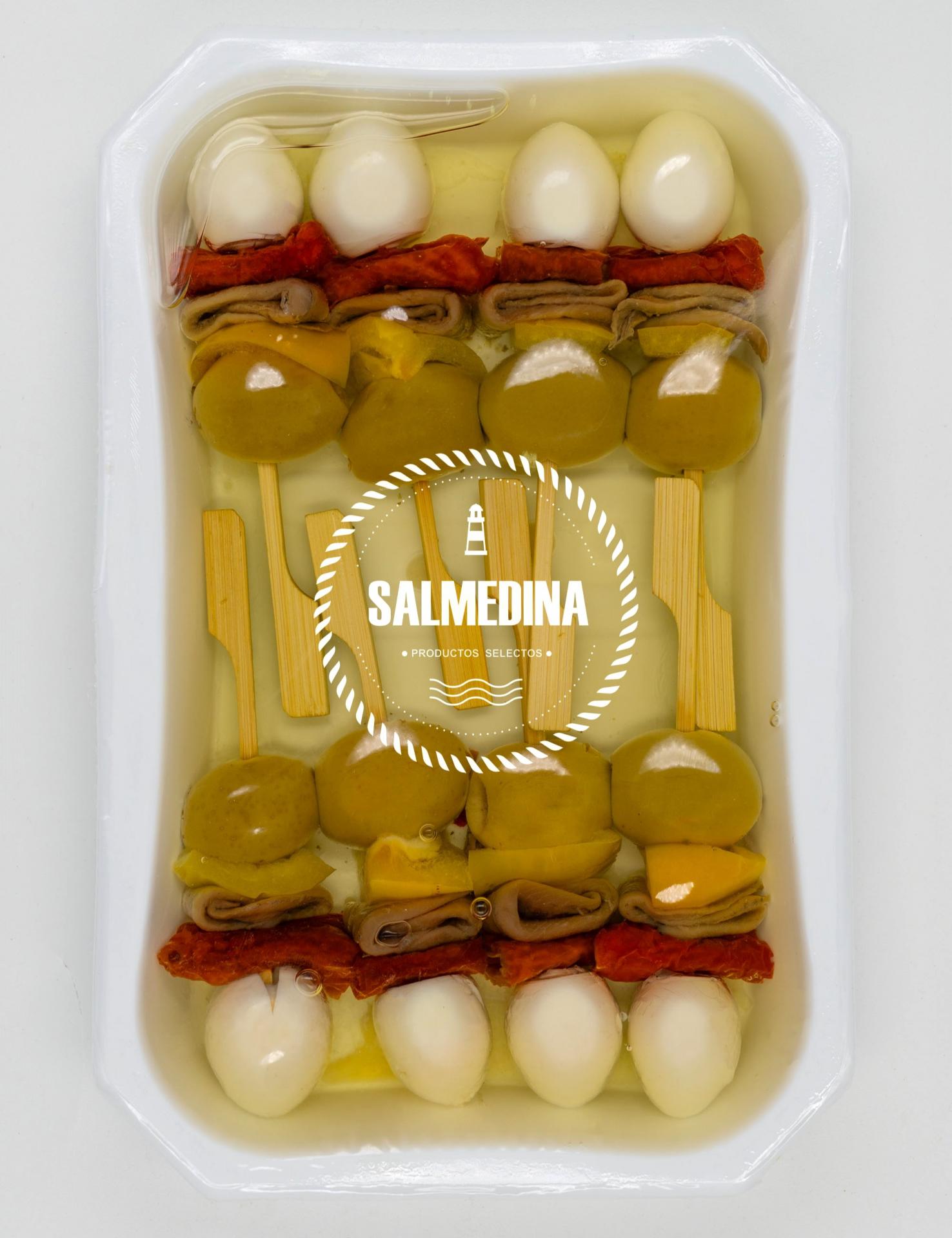 Tarrina de Gildas termosellada y con tapa transparente compuesta de aceituna gordal sabor chimichurri, anchoa, tomate seco, pimiento amarillo y huevo de codorniz. 8 Unidades