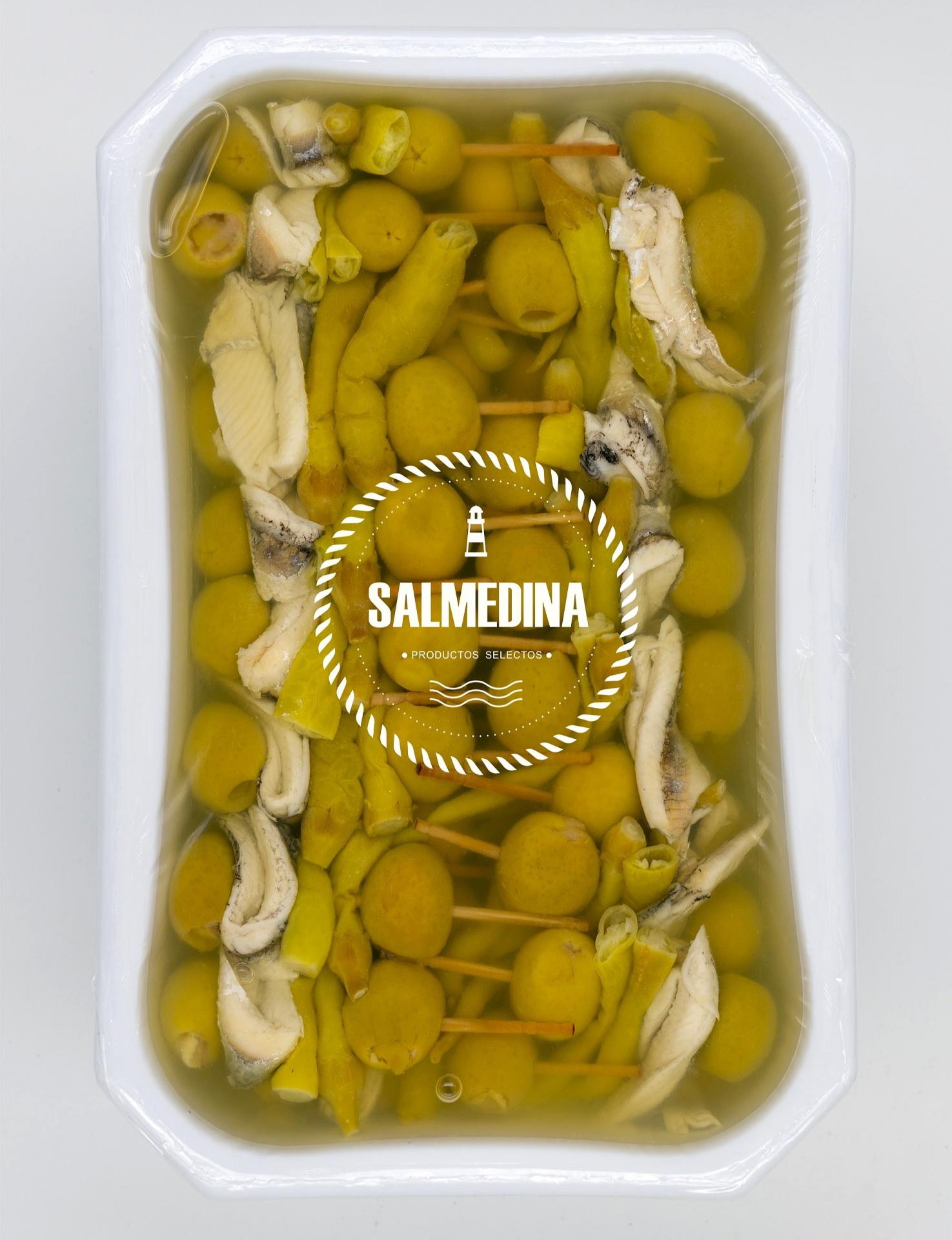 Tarrina de Gildas termosellada y con tapa transparente compuesta de aceituna, boquerón en vinagre y piparra. 64 Unidades